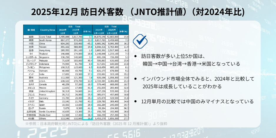 上記データでは、インバウンド市場全体が減速しているのではなく、「国別構造が変化している」ことを示しています。つまり、日本旅行への需要そのものが弱まっているわけではありません。訪日外客数の“構成”が変わっているのです。