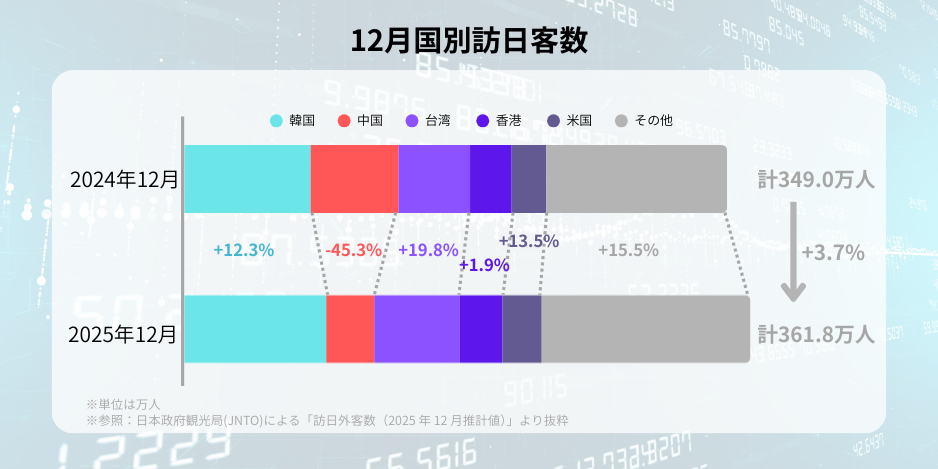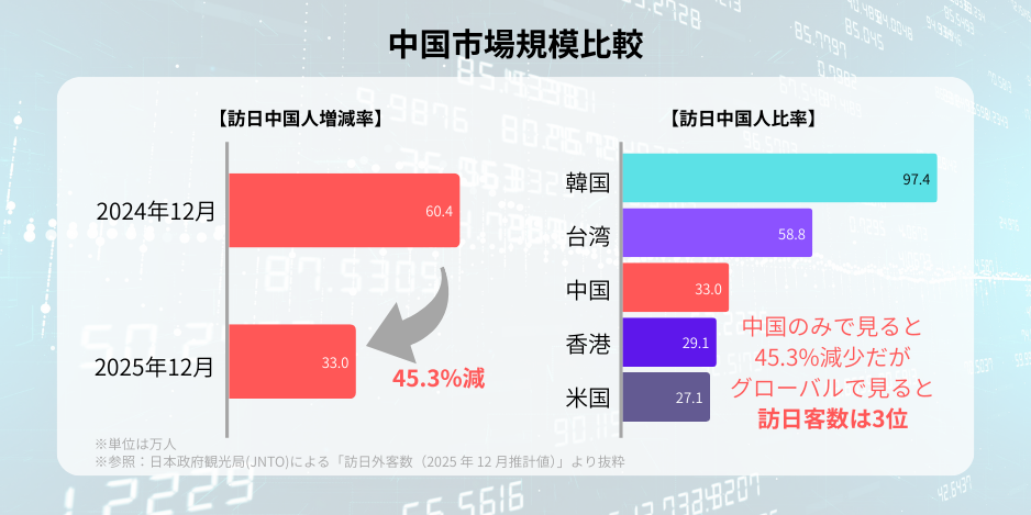 日本政府観光局(JNTO)が公表する「訪日外客数」データによると、2025年12月の訪日中国人数は前年同月比-45.3%となりました。主要市場の中でも突出した減少幅です。